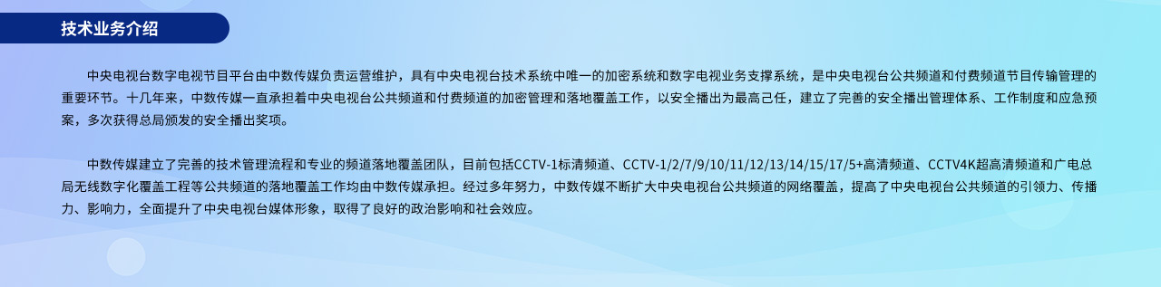 2018年10月開始,中數(shù)傳媒負(fù)責(zé)中國(guó)首個(gè)上星超高清電視頻道—中央廣播電視總臺(tái)4K超高清頻道的傳輸和落地宣傳工作,基本實(shí)現(xiàn)了中央廣播電視總臺(tái)4K超高清頻道的全國(guó)覆蓋。